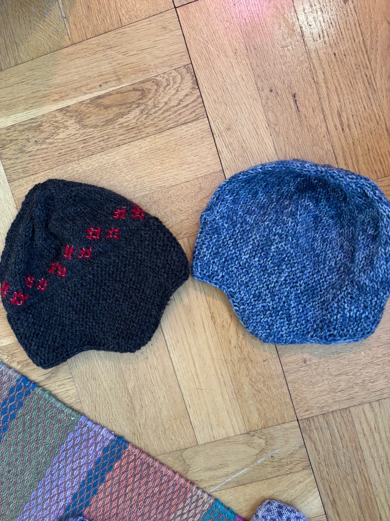 Löjligt snabbstickade, och varma är dessa mössor med öronlappar, stickade i tjockt garn och tjocka stickor. Beroende på avmaskningarna så böjer sig ”öronlappen” dessutom inåt, så att öronen håller sig varma. Extra uppskattat nu när det är så kallt ute:)