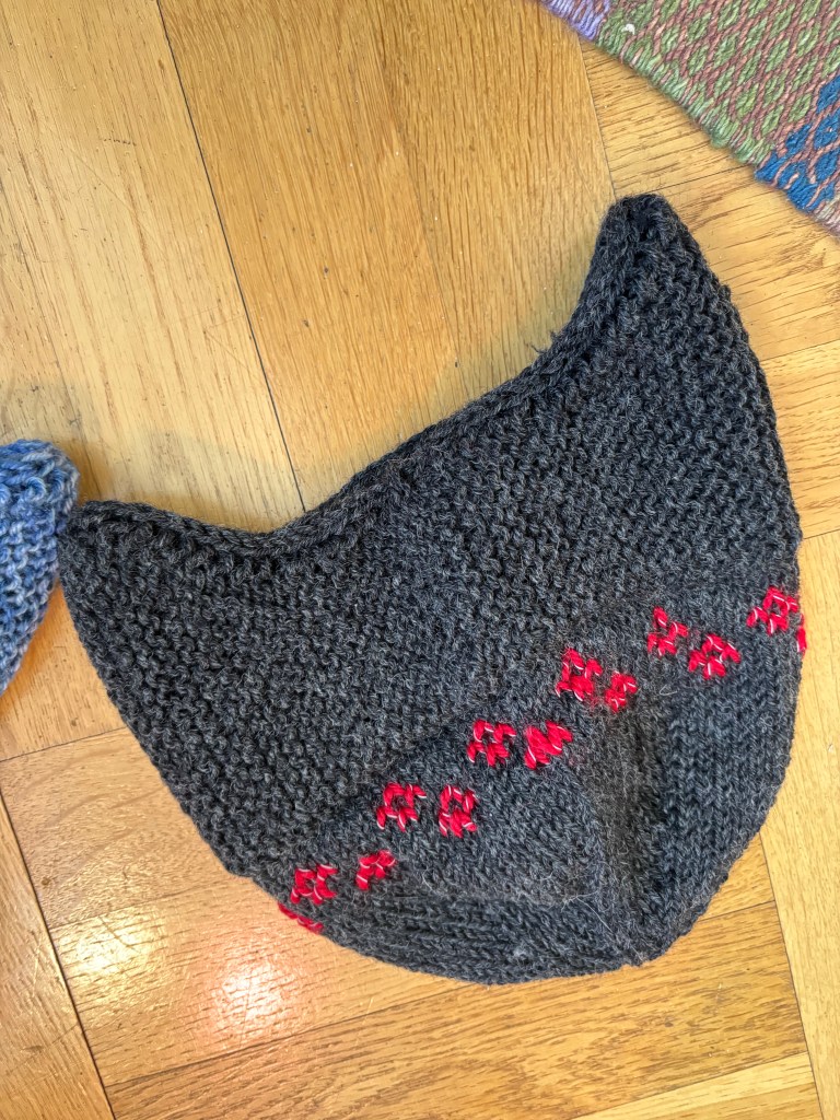 Såhär ser dom ut ”sidolapparna” jag har stickat på nedersidan på alla fyra sidor av raglanlångsidorna. Sidolappar som sedan syddes ihop och bildade midjan på varje sida. Såhär: